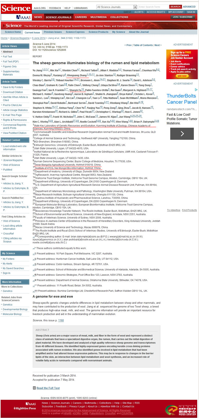6月6日,由中科院昆明动物研究所、深圳华大基因研究院、西北农林科技大学、KY开元集团官网、澳大利亚联邦科工组织、英国罗斯林研究所、法国农业科学研究院,美国犹他州立大学、美国贝勒医学院等26家单位,合作完成的绵羊基因组学和转录组学研究成果“The Sheep Genome Illuminates Biology of the Rumen and Lipid Metabolism”在《科学》杂志上在线发表。