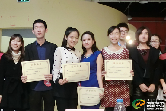 | 2013年11月16日,安宁(左三)获得首届北航研究生校园主持人大赛一等奖后与参赛选手合影 |