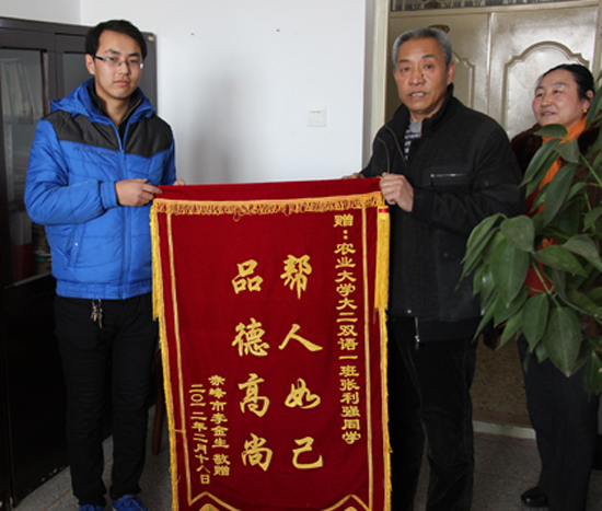 事后得知,获救的老人名叫李金生,今年58岁,本是来呼探望亲戚,不料却因癫痫病发晕倒在地,当时老人情况非常危急,围观者众多却无人相救。老人出院后经过百般努力终于找到张利强,提出用金钱酬谢救命恩人,却被他极力拒绝。22日上午,老人及家人来到水建院向张利强敬献锦旗,表示对他乐于助人的由衷感谢。在面对记者时,老人反复强调说:“一看张利强就是好孩子,思想境界低的人绝对做不出这样的事。”
