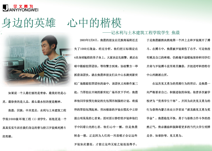身边的英雄 心中的楷模——记水利与土木建筑工程学院2000级环境工程(一)班学生 焦晨
