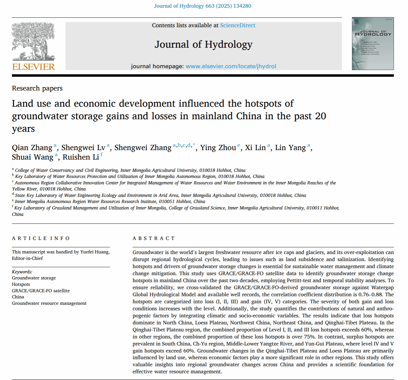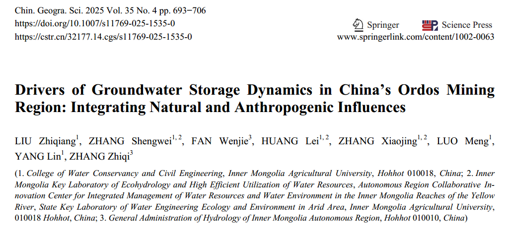 此外,今年七月该团队还在《Chinese Geographical Science》(中科院二区)发表题为“Drivers of Groundwater Storage Dynamics in China’s Ordos Mining Region: Integrating Natural and Anthropogenic Influences”的论文,揭示了中国鄂尔多斯矿区煤炭开采对地下水储量变化的影响机制。刘志强硕士为第一作者,张圣微教授为通讯作者。