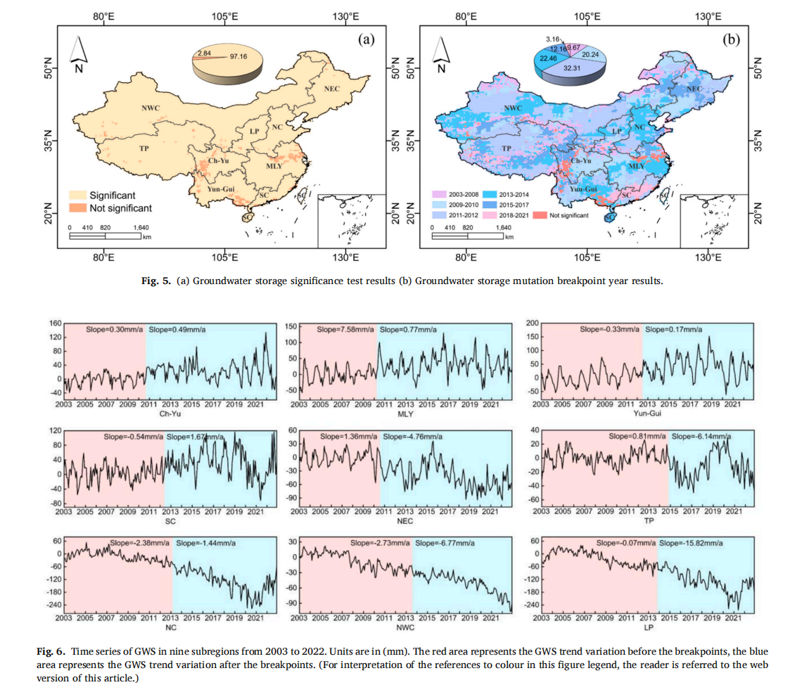 该成果系统揭示了过去二十年中国地下水储量的时空变化特征,发现多个区域地下水储量呈现稳定或增长趋势,特别是在华南、长江中下游、川渝及云贵高原等地区,地下水盈余热点占比超过60%。反映出我国在水资源可持续管理方面取得的显著成效。同时,研究也识别出华北、黄土高原、西北和东北等地区存在局部地下水储量下降的情况,这为进一步精准施策、优化水资源管理提供了明确的科学依据。