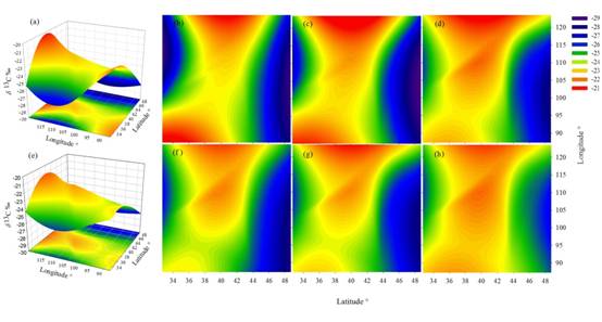 (a)和(e)分别表示放牧前后在经纬度尺度上的δ13C值,(b)~(d)为放牧前土壤0-5、5-10、10-15cm深度的δ13C值,(f)~(h)为草地退化后土壤0-5、5-10、10-15cm 深度的δ13C值。