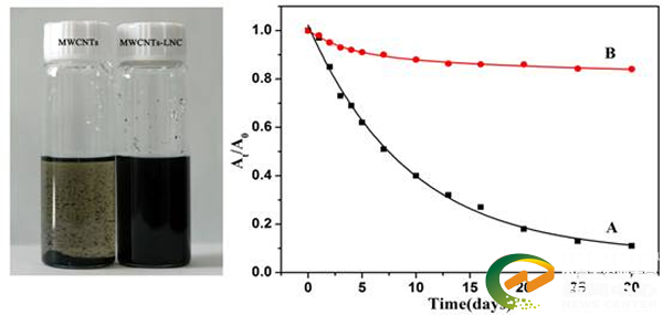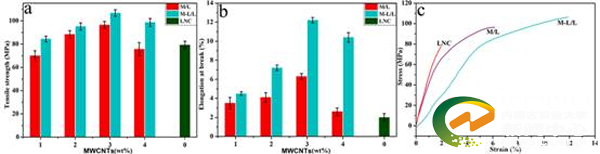 该研究首次用木质纤维素对碳纳米管进行共价包覆修饰,极大地提高了碳纳米管在溶剂中的分散能力,从而提高了木质纤维素/碳纳米管复合薄膜的力学性能。该方法可以广泛的应用于提高碳纳米管在高分子基体中的分散能力,从而提高复合材料的性能。