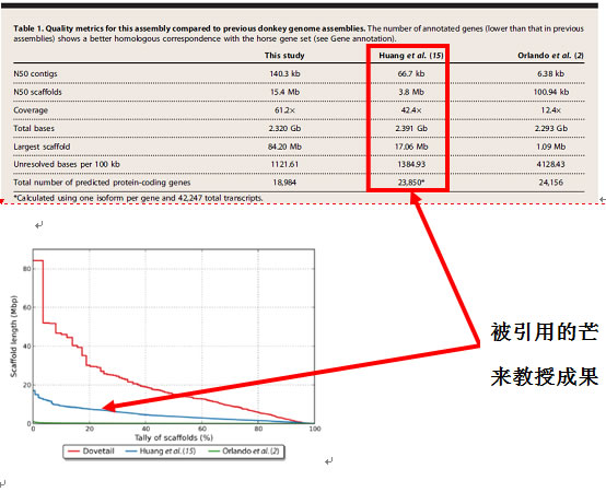此次Science刊出的《Improved de novo genomic assembly for the domestic donkey》的作者为马遗传学研究领域的顶级专家,曾在Nature(自然)和Science(科学)正刊发表过多篇文章。其研究工作引入了新的基因组组装技术,将驴基因组组装到亚染色体水平,并与芒来教授公布的驴基因组大小、注释基因数目、组装片段等内容进行比较(见下图)。其分析结果再次验证和肯定了芒来教授团队发表的论文在驴基因组研究方面的基础性和引领性的学术价值。