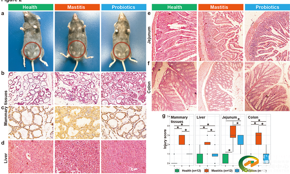 运用从奶牛到无菌孕鼠的垮物种粪菌移植,证实了失调的肠道菌群是引发乳腺炎的原因之一。基于该成果,采用益生乳酸菌Lactobacillus caseiZhang干预恢复肠道菌群功能的治疗策略,可以有效调控乳房炎鼠肠道菌群的代谢,缓解乳腺炎症,为无抗治疗乳腺炎提供了科学的依据。