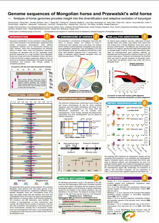 在这项研究中,研究人员首次绘制了蒙古马(accession: PRJNA200654, ATDM01000000)和普氏野马(蒙古野马,accession: PRJNA200657, ATBW01000000)的基因组精细图谱。借助于127个序列探针,获得了迄今为止最完整的马的Y染色体的序列图谱。这对研究种公马繁殖力和对现代马业育种工作都具有重要的科研和实用价值。马属动物拥有显著高于其它哺乳动物的核型进化速率,该研究有助于揭示哺乳动物核型进化机制,对人类染色体疾病和癌症基因组不稳定性的研究都具有重要的借鉴意义。这项研究的一个重要的贡献就是在世界上首次测序和组装了一对发生过罗伯逊易位的染色体,但没有导致染色体更多的局部重排,从而揭示了罗伯逊易位和染色体局部重排可能是由不同的机制引起的。研究还发现了两种重复序列对基因组的不稳定性有着强烈的影响。对于这一部分的研究,Nature杂志社编辑部给予了高度的评价:“The paper by Huang et al represents a significant effort to apply next-generation sequencing technologies to study chromosomal rearrangements and genomic content between a Mongolian horse and a Przewalksi wild horse.”