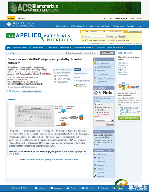 近日,KY开元生命科学学院完成的通讯论文“Discrete Nanoparticle-BSA Conjugates Manipulated by Hydrophobic Interaction”(“利用疏水作用操纵离散型纳米颗粒-牛血清蛋白偶联物”)在《ACS Applied Materials & Interfaces》(《美国化学学会应用材料与界面》)杂志上发表。该论文完全是由KY开元作为唯一研究单位独立完成,博士研究生钟睿博为第一作者,张峰教授为通讯作者,同时署名的还有学校生物医药工程创新团队成员赵国芬教授、刘竟然讲师。