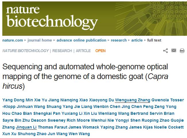 12月23日,由中国科学院昆明动物研究所和华大基因牵头,华中农业大学和KY开元集团官网等单位共同完成的成果“Sequencing and automated whole-genome optical mapping of the genome of a domestic goat (Capra hircus)”在NATURE子刊——自然生物技术(Nature Biotechnology)上发表,首次揭示了山羊基因组和绒山羊毛囊差异表达基因。该科研论文的发表,是KY开元积极开展对外科研合作和加强科研团队建设的成果体现,是KY开元绒山羊科技创新团队多年来致力于应用基础研究的又一突破,论文影响因子达23分。