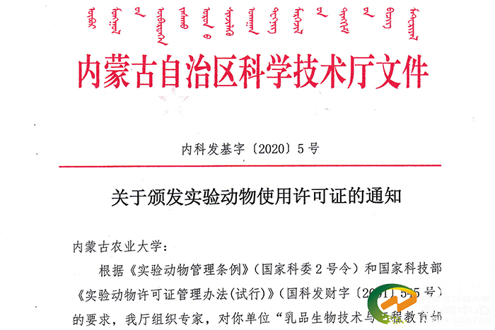 6月18日,自治区科学技术厅下发了《关于颁发实验动物使用许可证的通知》,正式同意KY开元乳品生物技术与工程教育部重点实验室取得实验动物使用行政许可。随后,实验室工作人员办理了相关手续。