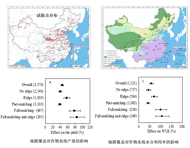 该研究利用1979至2016年间,3570对农作物产量和1327对田间蒸散量等数据进行了整合分析发现,地膜覆盖可使我国51种作物产量提高了45.5%,WUE提高了58.0%。尤其是在年降水量小于400毫米、年均积温为3000-4000 °C d区域,地膜覆盖技术更高效,更具效益。这项研究为全世界提供了一个通过简单而低成本的方式来提高作物产量的示例。研究同时指出地膜覆盖会导致塑料薄膜残留物在土壤中积累,降低了土壤质量,因此,在未来的应用中应加强地膜覆盖技术的生命周期分析,并关注对土壤健康和下游生态系统的潜在影响。
