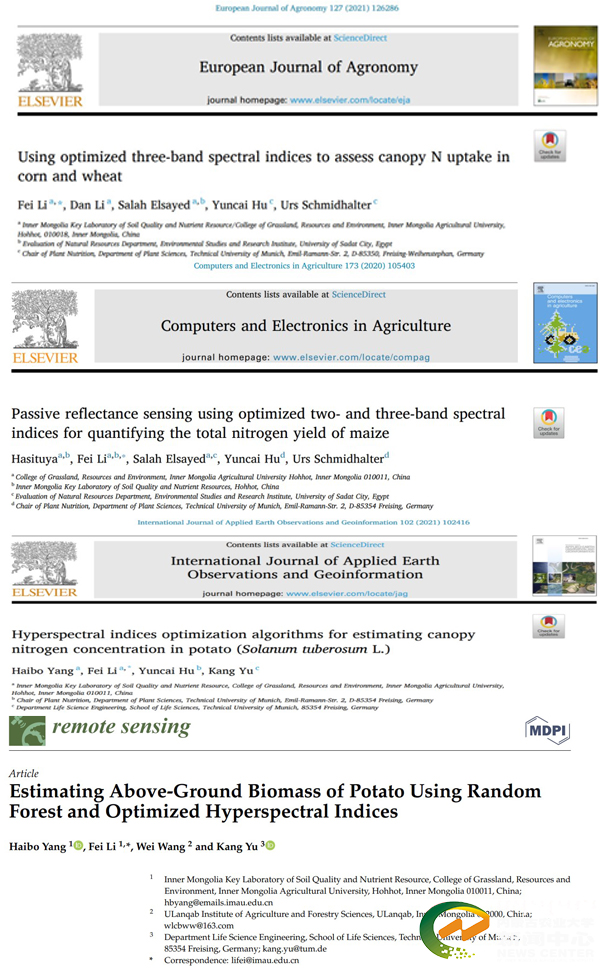 李斐教授本人为《Using optimized three-band spectral indices to assess canopy N uptake in corn and wheat》的第一作者和通讯作者。哈斯图亚老师为《Passive reflectance sensing using optimized two and three-band spectral indices for quantifying the total nitrogen yield of maize》的第一作者,李斐教授为通讯作者。博士生杨海波为《Hyperspectral indices optimization algorithms for estimating canopy nitrogen concentration in potato (Solanum tuberosum L.)》和《Estimating Above-Ground Biomass of Potato Using Random Forest and Optimized Hyperspectral Indices》的第一作者,李斐教授为通讯作者。四篇论文的第一完成单位和通讯单位都是学校,这些研究得到了国家自然科学基金项目、公益性行业科研专项、内蒙古自治区科技攻关等项目的支持。