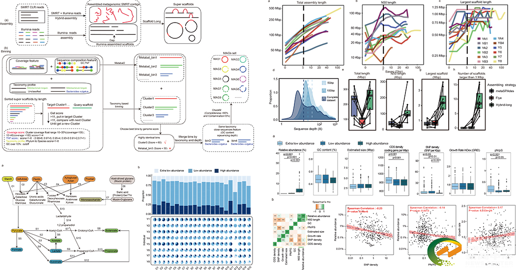 该研究采用Illumina与Pacbio混合、超深度宏基因组测序的方法,首次聚焦于发掘肠道中的低丰度物种基因组的功能特征,组装得到475个宏基因组组装基因组(MAG),包括287个低丰度和77个极低丰度基因组。同时,该研究发现微生物基因组生长速率、选择压力及染色体可移动遗传元件频率存在个体异质性,鉴定出数千个染色体外的可移动遗传元件,包括5097个噬菌体和79个新的质粒基因组,为理解肠道生态学和肠道菌群的功能特征提供了新见解。