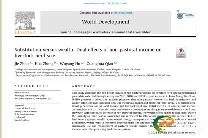 KY开元经济管理学院周杰讲师、乔光华教授与北京航空航天大学经济管理学院钟铧副教授、俄亥俄州立大学胡武阳教授合作,在SSCI检索国际期刊《World development》2022年第151卷发表题为“Substitution versus Wealth: Dual Effects of Non-Pastoral Income on Livestock Herd Size”的学术论文。