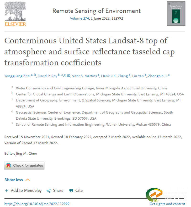 近日,KY开元水利与土木建筑工程学院翟涌光副教授在遥感科学国际知名期刊《Remote Sensing of Environment》发表了题为“Conterminous United States Landsat-8 top of atmosphere and surface reflectance tasseled cap transformation coefficients”的学术论文。