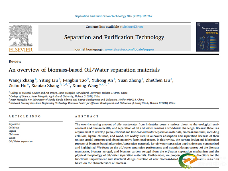 近日,学校沙生灌木资源高效利用创新团队张晓涛教授课题组在生物质油水分离材料应用研究方面取得重要突破。其学术成果“An overview of biomass-based oil/water separation materials”在国际分离纯化技术领域权威期刊《Separation and Purification Technology》(中科院SCI工程技术一区TOP期刊,IF=9.136)上在线发表。该文章综述了目前用于油水分离领域的生物质材料设计和应用的最新研究进展。