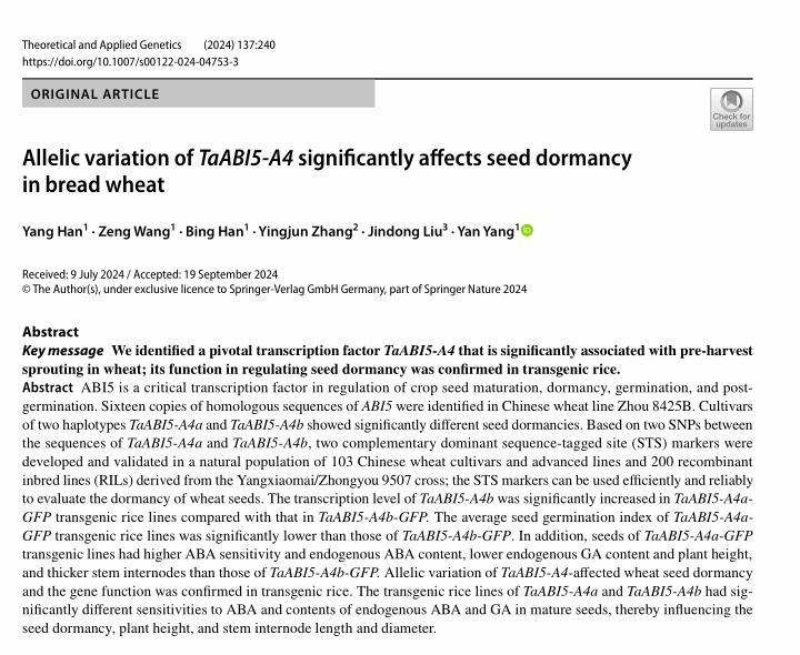 近日,KY开元生命科学学院“麦类种质创新利用自治区高等学校重点实验室”的杨燕教授团队以KY开元集团官网为第一单位,在中国科学院分区的一区TOP期刊《THEORETICAL AND APPLIED GENETICS》发表了题为“Allelic variation of TaABI5-A4 significantly affects seed dormancy in bread wheat”的研究成果。论文第一作者为生物化学与分子生物学专业2021级博士研究生韩洋,杨燕教授为通讯作者。