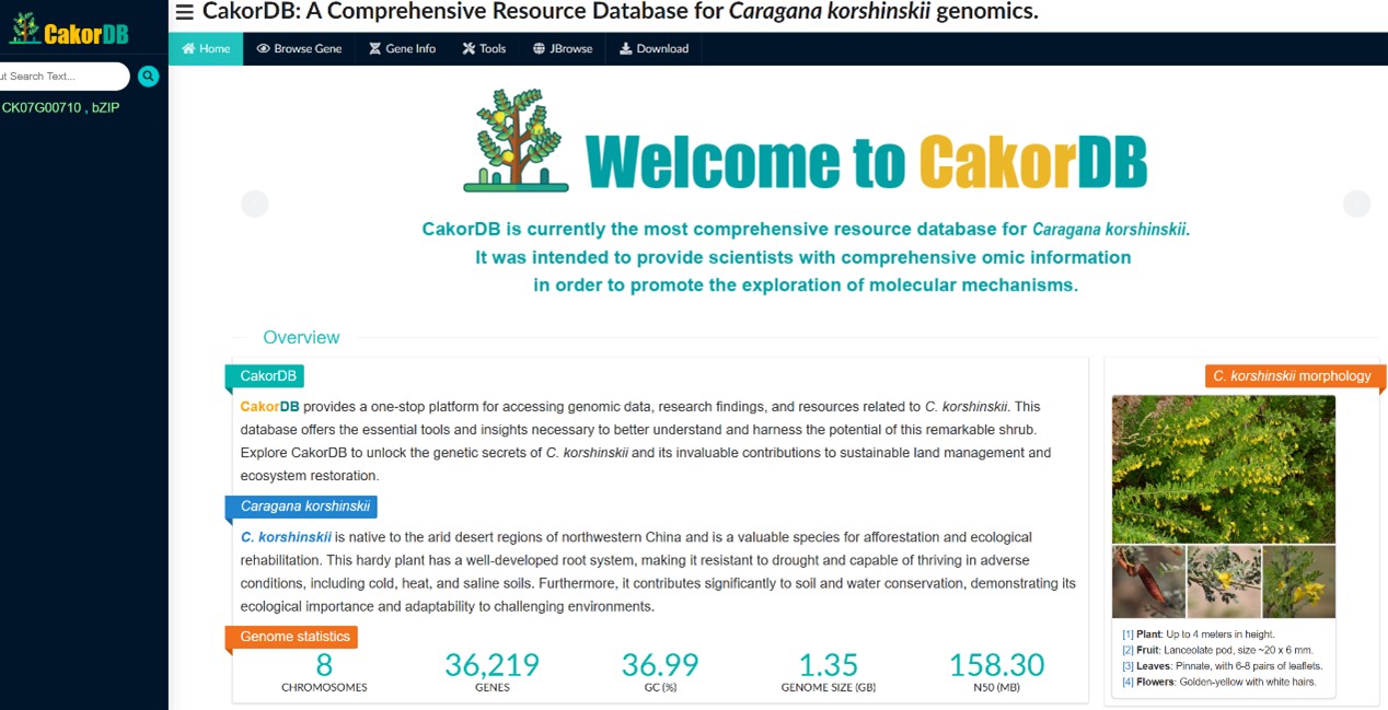 研究团队利用三代长读长测序技术组装完成了柠条的染色体级别参考基因组约1.35 Gb,注释到36219个蛋白质编码基因,搭建了柠条组学数据库分析平台CakorDB。