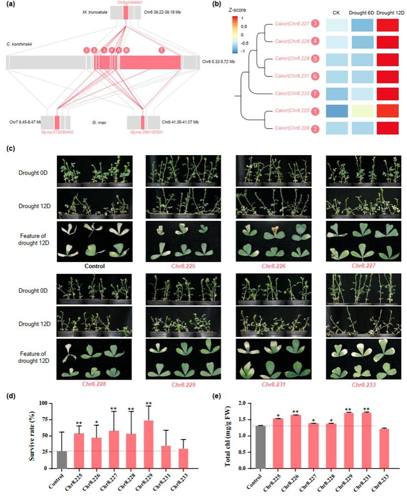 为了解析何种遗传改变赋予了柠条在广袤旱区极强的适应能力,通过一系列比较和进化基因组学分析发现:柠条所在的锦鸡儿属未发生过属水平的全基因组复制事件,而是串联重复扩增在该物种的适应性进化中起到了关键作用;特别是早期光诱导蛋白early light-induced protein(ELIP)、热激蛋白heat shock protein 100(HSP100)和脱水蛋白Dehydrin (DHN)等参与细胞保护和修复的关键基因家族通过串联重复显著扩增,使柠条具备了类似于复苏植物的基因组特质。团队建立了柠条瞬时过表达和VIGS基因沉默体系,对串联重复扩增的DHN基因家族成员进行了功能验证,表明关键基因的扩增及高表达可以显著提高柠条的抗旱能力。