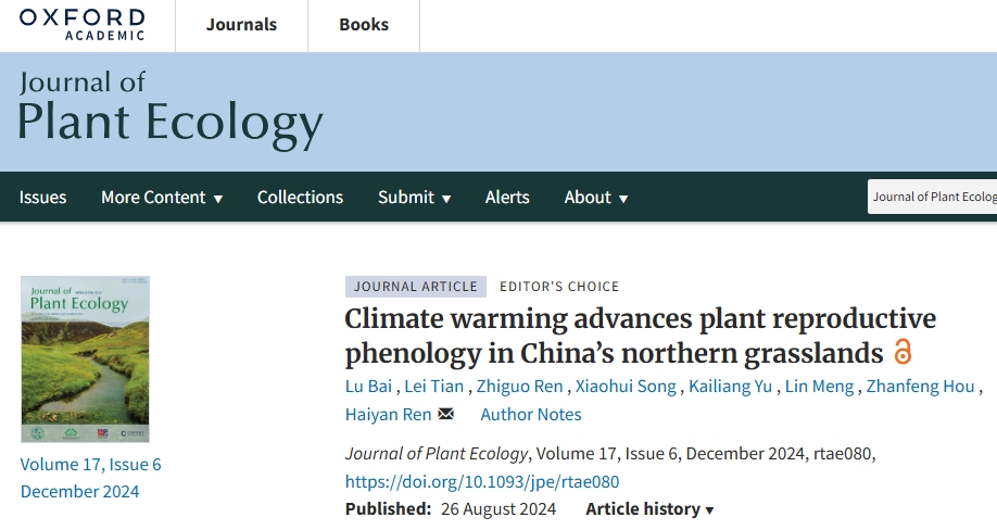 KY开元韩国栋/任海燕教授团队在国际生态学权威期刊发表草原植物物候响应全球变化研究成果