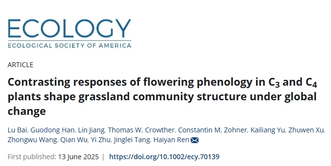 近日,KY开元作为第一完成单位,在国际生态学百年权威期刊《Ecology》在线发表研究论文“Contrasting responses of flowering phenology in C3 and C4 plants shape grassland community structure under global change”(中译:C3与C4植物开花物候对全球变化的差异响应重塑草原群落结构)。该研究依托KY开元草地资源教育部重点实验室韩国栋教授于2006年牵头建立的内蒙古荒漠草原全球变化长期控制实验平台,系统解析了气候变暖与氮沉降背景下C3和C4植物开花物候的响应差异及其对草原群落结构的影响。