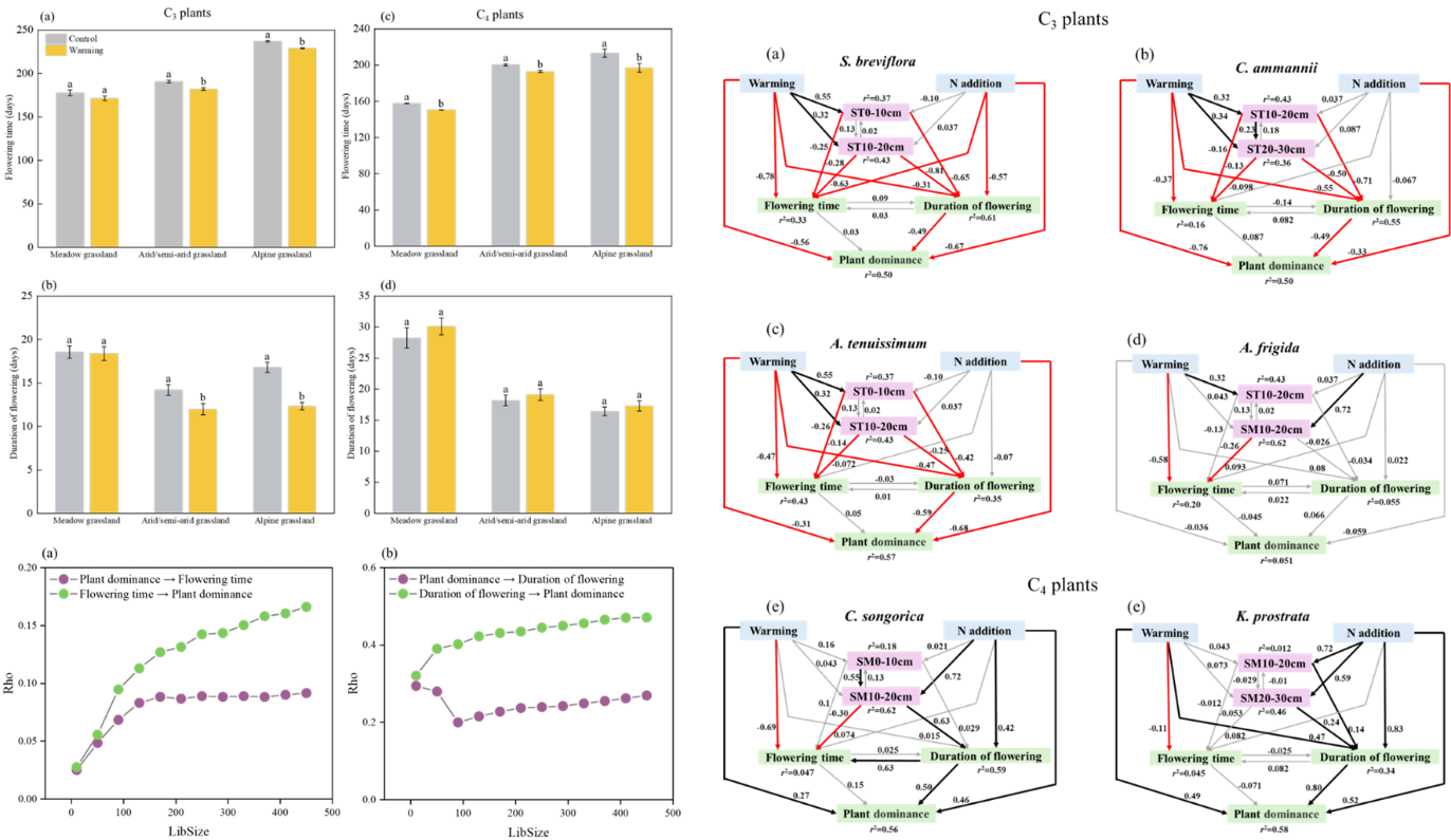 研究表明,C3植物对气温升高更敏感,花期提前、持续时间缩短,优势度下降;而C4植物在氮添加下花期显著延长,优势地位增强。收敛交叉映射模型结果表明,物候变化对植物优势度的影响大于反向作用,强调了物候在群落演替中的关键作用。结合全国多个草地生态系统数据,进一步证实了该物候响应模式具有广泛一致性。结构方程模型表明,土壤温度和水分有效性是驱动物候变化的关键因子,而生殖性状(如每株生殖枝数)是预测植物优势度的重要指标。