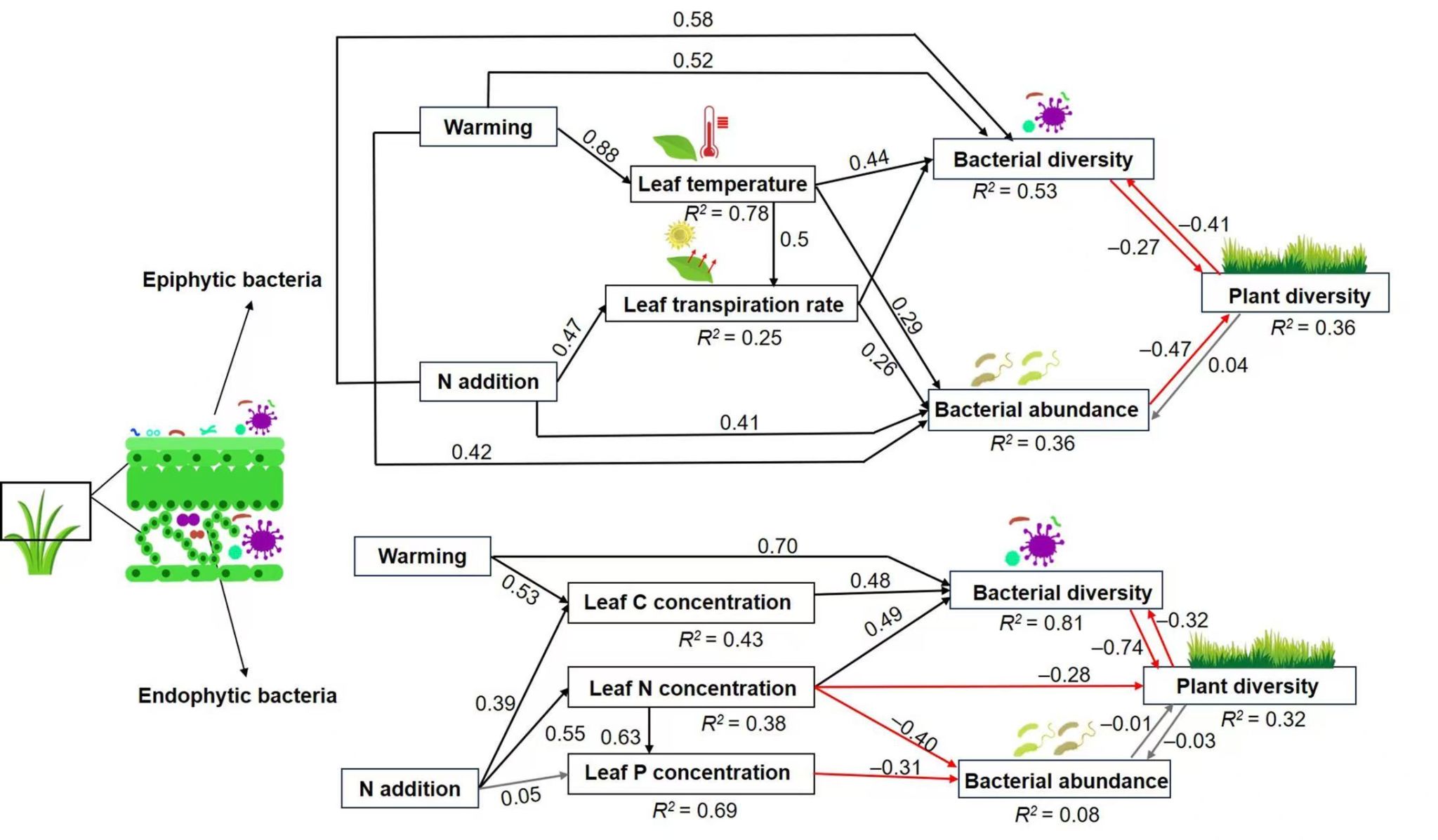 在《Journal of Integrative Plant Biology》发表的研究成果题为“Long-term climate warming and nitrogen deposition increase leaf epiphytic and endophytic bacterial diversity”,论文的第一作者为学校2022级博士研究生白璐,通讯作者为任海燕教授和美国佐治亚理工学院蒋林教授。该研究聚焦荒漠草原植物叶际微生物对全球变化的响应,表明增温和氮添加均显著提高了叶附生和内生细菌的多样性,但其机制不同,叶附生菌群的变化主要受叶温和蒸腾速率驱动,而内生菌群则与叶片碳氮含量密切相关。结构方程模型表明,植物多样性的下降与细菌多样性的升高呈负相关,可能与优势植物无芒隐子草(Cleistogenes songorica)所主导的“质量效应”增强有关。此外,增温和氮添加促进了Acidovorax与Pseudomonas等潜在致病菌的富集,可能通过抑制植物免疫系统功能而影响群落稳定性,拓展了对全球变化背景下植物—微生物互作机制的认识。