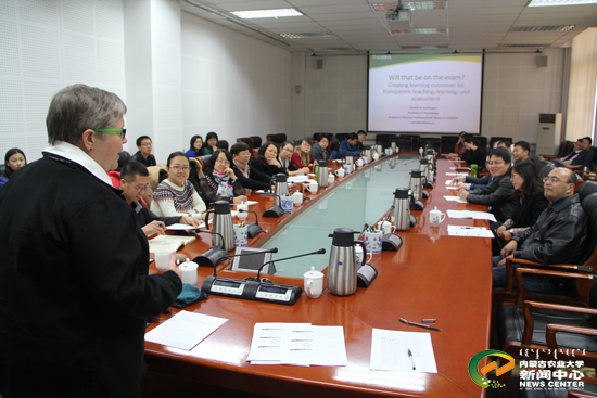 上午,瓦恩哈根教授在专题讲座中,从“如何处理好教与学”入手,引入了建立“教学发展中心”机构的建议,以帮助老师分析学生要求、设计教学策略、检验实际教学。她用图文结合的方式,形象地向老师们展示了“教学发展中心”的模式和结构,详细阐述了“教学发展中心”可以作为学校与师生建立良好关系平台的重要意义。
