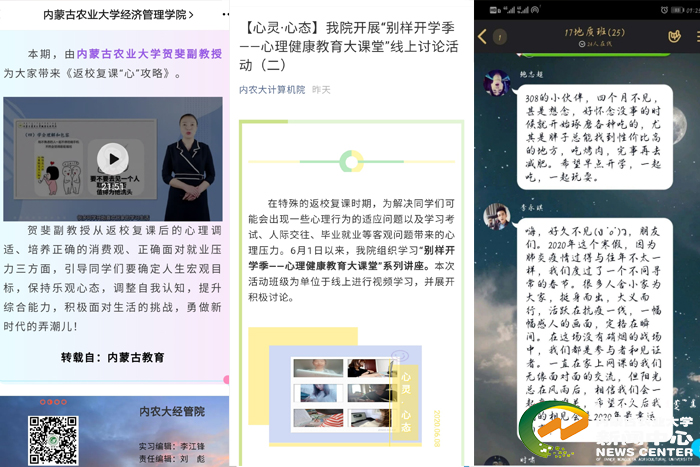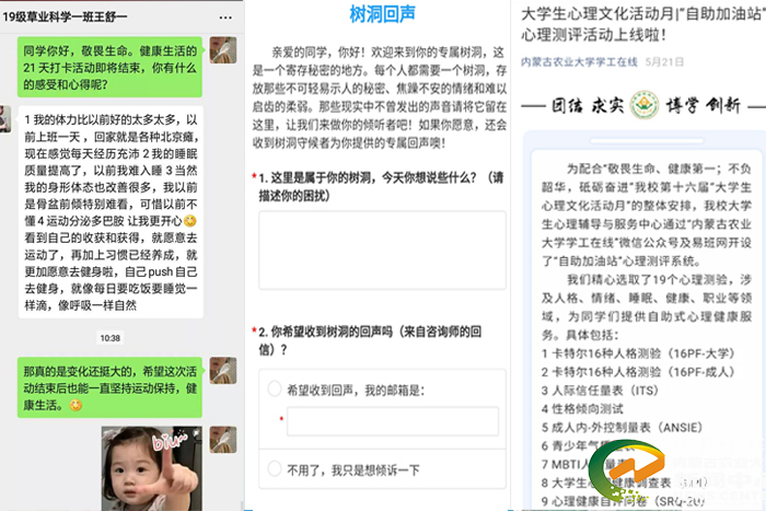 此外,针对学生疫情期间心理疏导、考试和就业压力、家庭关系紧张等心理健康需求,学校专兼职心理咨询师队伍每周14次(每天上下午)、每次3小时开放免费咨询时间,帮助学生觉察问题,提供应对之策。截至目前,已协同各学院为学生提供咨询服务300余人次。开通了学校24小时心理援助热线(0471-4306463),为广大学生提供心理援助服务。同时加强对学生的人文关怀和心理疏导,畅通了学生与班主任、辅导员、心理健康教育中心,家庭与学校之间的沟通渠道,班主任与每一位班级学生进行了“点对点”沟通交流,学生工作处对123名湖北籍学生以及64名假期去往(或途径)武汉的学生从学校层面进行了“一对一”交流,各学院为重点关注学生建立了心理档案,最大限度地防止心理危机事件的发生。
