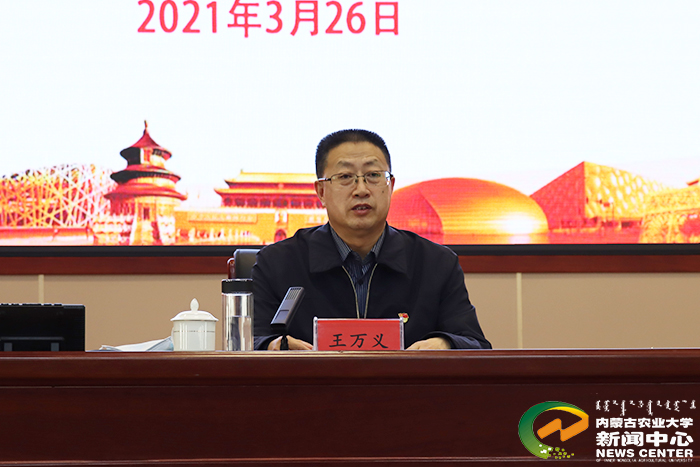 王万义强调,2020年,是学校“十三五”圆满收官,高质量谋划“十四五”发展启动的关键一年;也是学校师生度过的凝心聚力、攻坚克难的极不平凡的一年。一年来,全体党员干部认真贯彻落实党的建设要求,积极推进全面从严治党,有效保障和服务学校中心工作。在疫情防控,推进“三科”教材使用、维护安全稳定,以及保障人才培养质量,强化一流本科建设、一流学科建设和科研社会服务等方方面面,都取得了较好的成绩。2021年学校全面从严治党工作要始终坚持以习近平新时代中国特色社会主义思想为指导,深入学习贯彻落实十九届中央纪委五次全会精神、自治区纪委十届七次全会精神以及教育部和自治区教育系统从严治党工作会议精神,坚持从严从实管党治党,扎实开展党史学习教育,着力提高干部师生政治“三力”,保障服务学校“十四五”事业良好开局起步,有效落实立德树人根本任务,以更加昂扬的精神状态和奋斗姿态,建功新时代、奋进新征程,更好书写习近平总书记和党中央关于加强内蒙古生态文明建设和乡村振兴战略文章,有效落实习近平总书记和党中央赋予内蒙古的“两个屏障”“两个基地”和“一个桥头堡”的发展战略定位。精心呵护“模范自治区”崇高荣誉,更好地助力打造祖国北疆亮丽风景线,以优异成绩庆祝中国共产党成立100周年、迎接建校70周年。