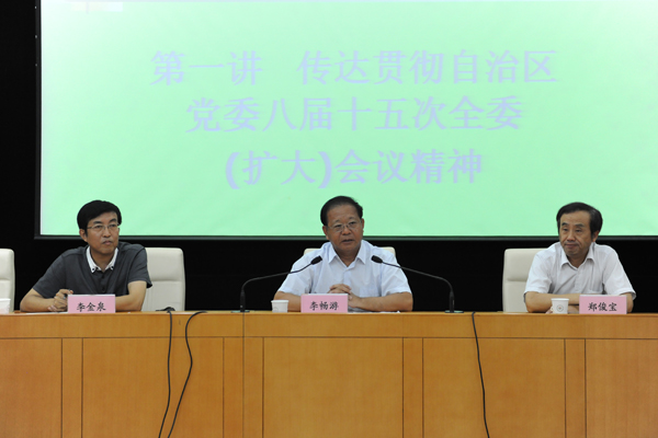 培训班上,郑俊宝副书记传达了自治区党委八届十五次全委(扩大)会议精神。会议明确了贯彻落实国务院《关于促进内蒙古自治区经济社会又好又快发展若干意见》的各项要求,在事关全区改革发展稳定等重大问题上进一步统一了思想、完善了思路、指明了方向。