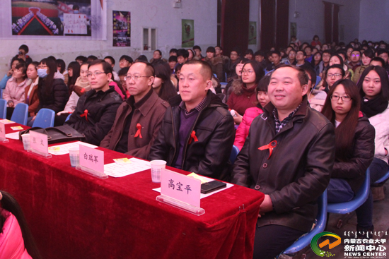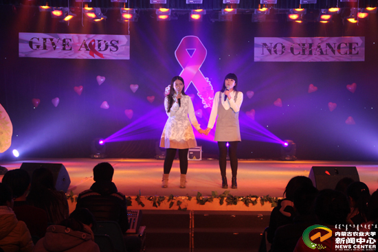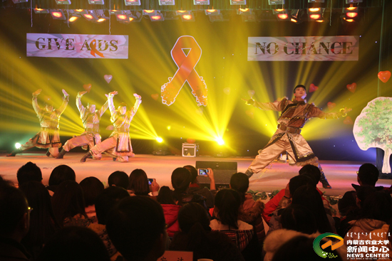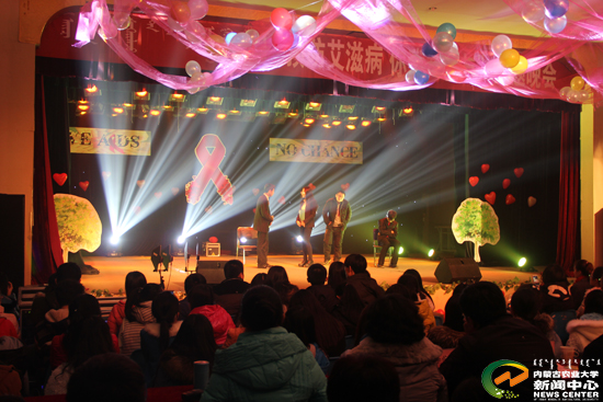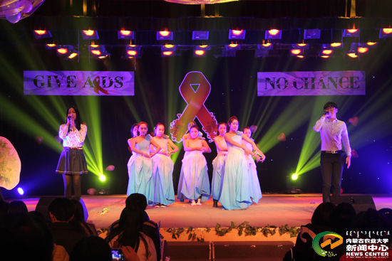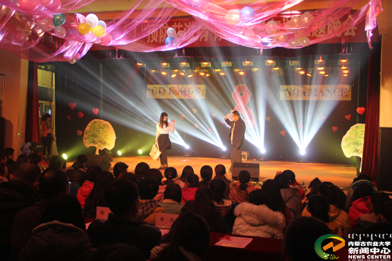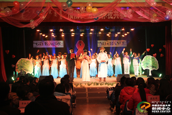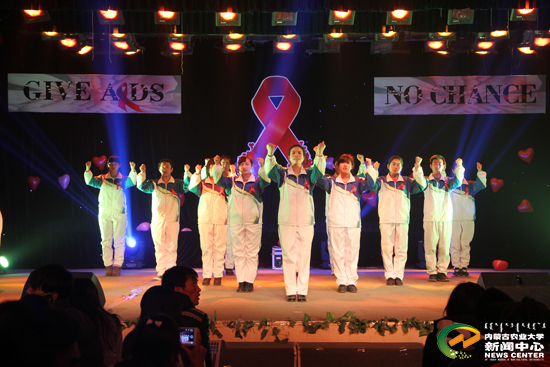 晚会在索伦歌艺术团《小手拉大手》甜美活泼的歌声中拉开帷幕,“小手拉大手一起加油,向昨天挥挥手”,真挚的歌词唱出了同学们对艾滋病病人和感染者的关怀和鼓励;手语表演《感恩的心》通过尚礼国学社同学的精彩演绎触动了每个人心中那份感动。晨雁话剧社自编自导自演的话剧把同学们带入跌宕起伏的情节和感人至深的人物独白之中——《爱到明天》以大学生恋爱为主线讲述了亲情、爱情、友情的可贵;《撑起一片天》则讲述了单亲妈妈为抚养女儿卖血而感染艾滋病的故事。话剧用生动的故事为大家演绎了艾滋病对个人、家庭、社会的影响,呼吁大家共同关爱艾滋病病人和感染者,积极参与艾滋病的防治工作。通过话剧形式宣传艾滋病防治知识,在我区尚属首次。
