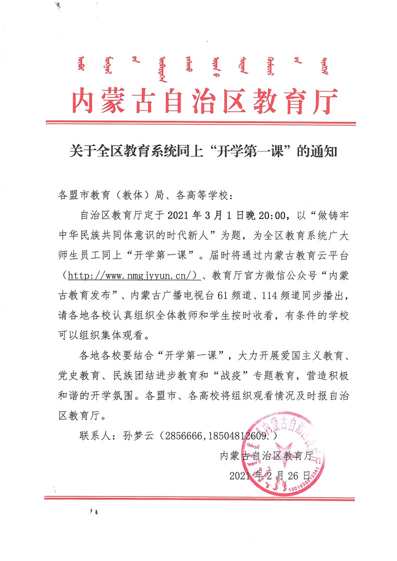 按照自治区教育厅《关于全区教育系统同上“开学第一课”的通知》精神和学校领导的批示要求,请各分党委(党总支)组织本单位全体师生员工于今天(3月1日)晚上8:00收看教育厅组织的以“做铸牢中华民族共同体意识的时代新人”为主题的开学第一课。