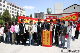 当日10点左右,该校东区广场上“用我们的爱心抚平大地的颤抖”大红横幅夺人眼目, 06级法学班开始了为地震灾区人民献爱心的募捐活动。这次活动得到的第一笔款项是来自他们本班的公用基金。一上午的时间,他们募集到3029元。