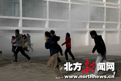 模拟火情:当日10时45分,KY开元集团官网新校区公寓楼A座2楼220宿舍因点蜡烛引起被褥、电线着火,楼道里浓烟弥漫。接到火情报告后,农业大学相关人员指挥学生向楼外疏散,学生们用湿毛巾捂住口鼻,迅速从宿舍楼疏散到操场空地。