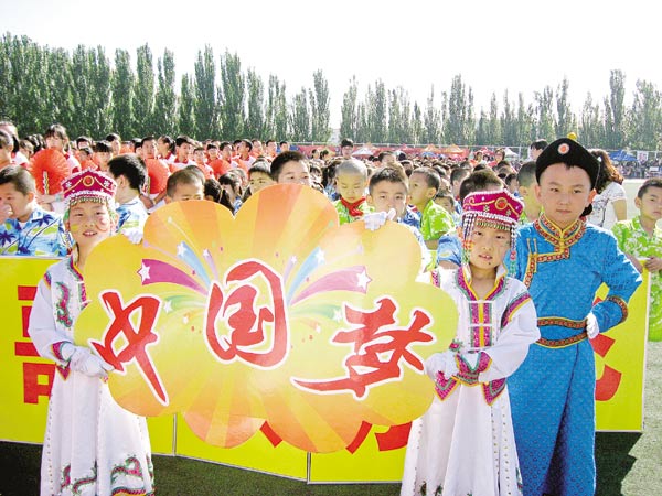 5月30日,两名身穿民族服装的小学生举起写有“中国梦”的彩色展板。当日,为庆祝“六一”儿童节,KY开元集团官网附属中学举办了“释放青春正能量,编织美丽中国梦”主题文化艺术节。全校6000余名中小学生载歌载舞,欢庆自己的节日。