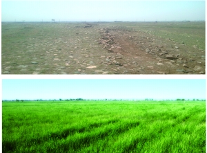 蒙草抗旱公司在呼和浩特市承担了大青山南麓敕勒川草原恢复建设项目,取得了巨大成功,不仅使原本砂石裸露、满目疮痍的当地地表地貌又恢复到原来的绿草如茵、一碧千里的景象,生态环境得到极大改善。而且经国内专家考察鉴定,其生态系统也开始逐步恢复,已初步实现草——草原——生物链这一生物圈的良性循环,从而成为蒙草抗旱探索草原生态系统修复新模式中的典范工程。