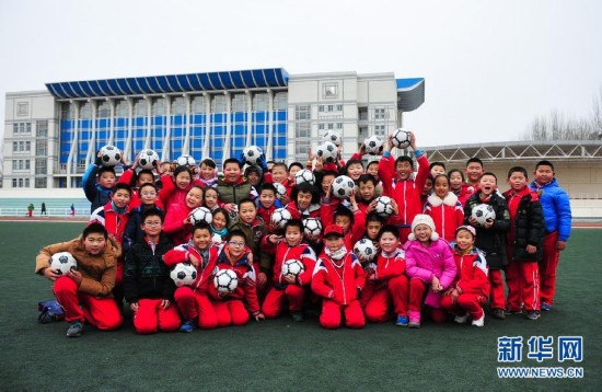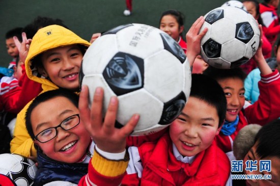 12月9日,参加活动的四年级小学生们在展示获捐赠的足球。当日正逢“世界足球日”,内蒙古足球协会在KY开元集团官网附属小学举办了足球进校园捐赠活动,为KY开元附小的学生捐赠了100个少儿足球,让足球运动“从娃娃抓起”。