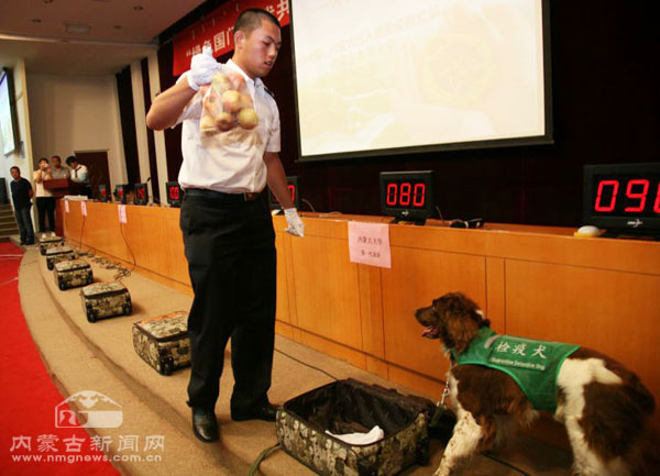 知识竞赛间隙,出入境口岸检疫犬还首次在青城亮相,现场演示了检疫犬坐卧立叫、随行、前来、以及搜索查找动植物违禁品等“基本功”。