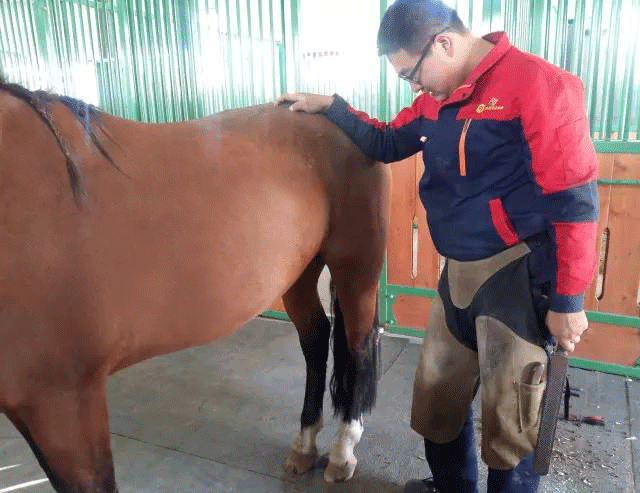 当领导说要将工作重心逐渐调整到钉蹄、修蹄上来之后,赵旭并没有表现出惊讶或不适应。“因为我在学校的时候就经常给马钉蹄。”赵旭介绍,自己的专业学习涉及到马相关的各个领域,马的饲养、运输、修蹄、骑乘等。兴趣使然,他的学习重点一直就在钉蹄、修蹄上。