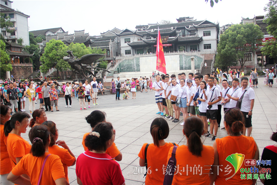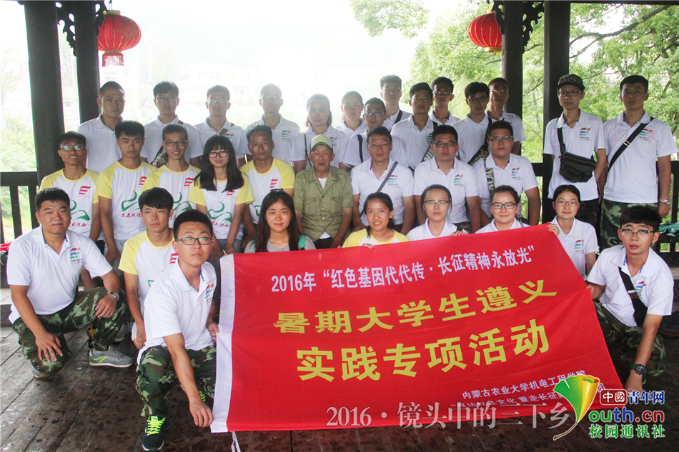 在贺龙桥上偶遇吉首大学三下乡实践队,两所学校的师生充分交流,同学们共同为当地居民表演文艺节目;现年86岁的抗美援朝老兵谭泽然,应邀加入到合唱队伍中,为同学们演唱了两首抗美援朝时期的歌曲,为大家讲述了抗美援朝的故事,并期望大家做祖国的栋梁之才。