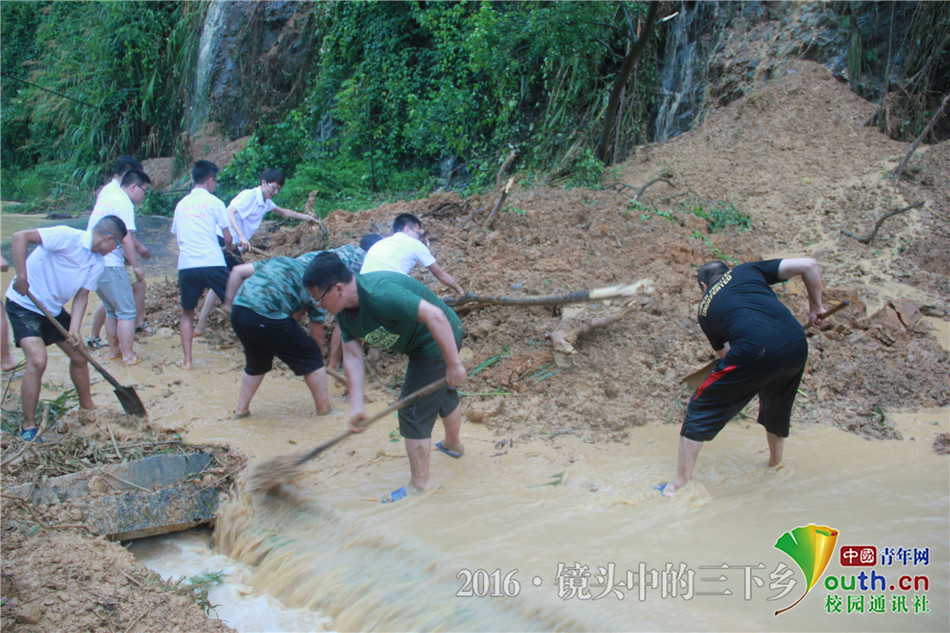 实践队在乘车前往贺龙故居途中,突遇暴雨,山体滑坡,落石泥沙树木挡住前行的路,队员们不顾随时再有塌方的危险,冒着大雨,毅然决然投入排除塌方、抢通道路中。队员们利用简单的工具清理泥石、树木,一个小时后在大家的共同努力下,道路畅通,尽管队员们全身泥泞但胜利的喜悦洋溢在每一个人脸上。患难时刻大家没有丝毫畏惧和退缩,彰显出机电人不畏艰险,勇往直前的优秀品质。