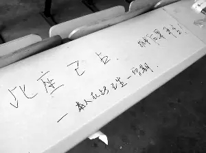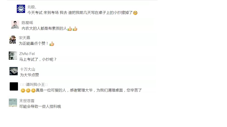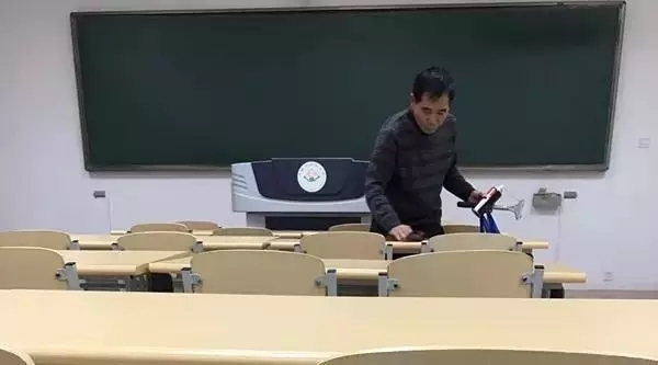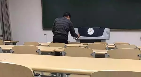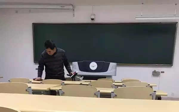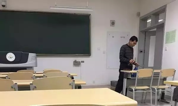 大家都知道,每年的两场期末考试,同学们都会来一场起早贪黑、恶狠狠的复习,部分同学也会走上“歪门邪道”,做缩印的小抄,利用身体有限的“空地”,还有的同学在知道考场后便早早的在考场桌面上大笔一画“占座”,然后在将考试重点用心的抄到桌面上,这些留在桌面上的痕迹,你也不带走,是不是?但是,这一切却留给了另一些人,那些和这位大爷一样默默坚守在工作岗位上的人。