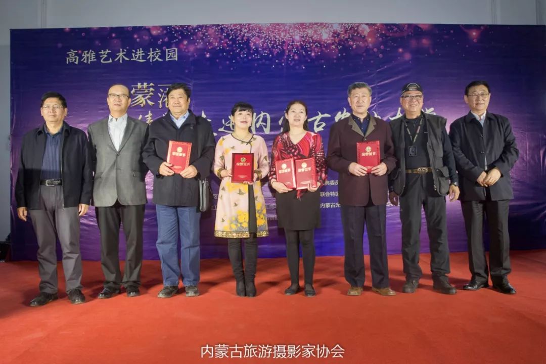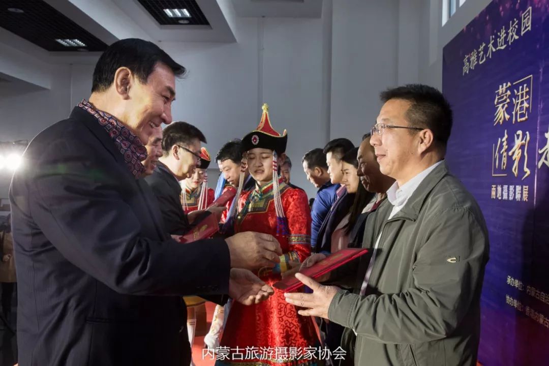 内蒙古自治区摄影家协会主席乌拉汗,香港特区摄影学会会长刘锦麟,内蒙古旅游摄影家协会副主席郭伟忠,内蒙古旅游摄影家协会副主席赵新民为二等奖获得者吴英凯、色·恩克图布新、 张丽、 白丽萍、宋自琦颁奖。