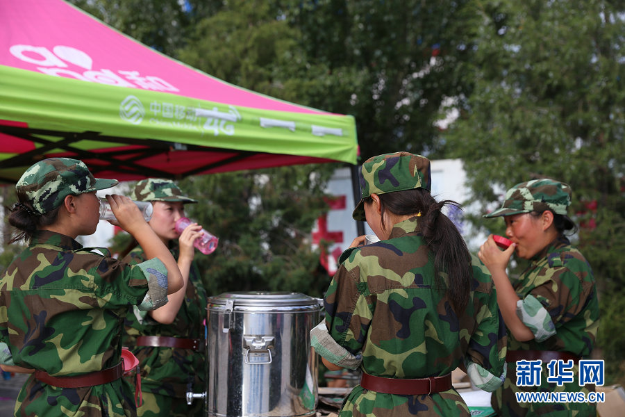 | 9月8日下午,学生到饮水区喝水,这是学生军训中的“能量补给站”。 |