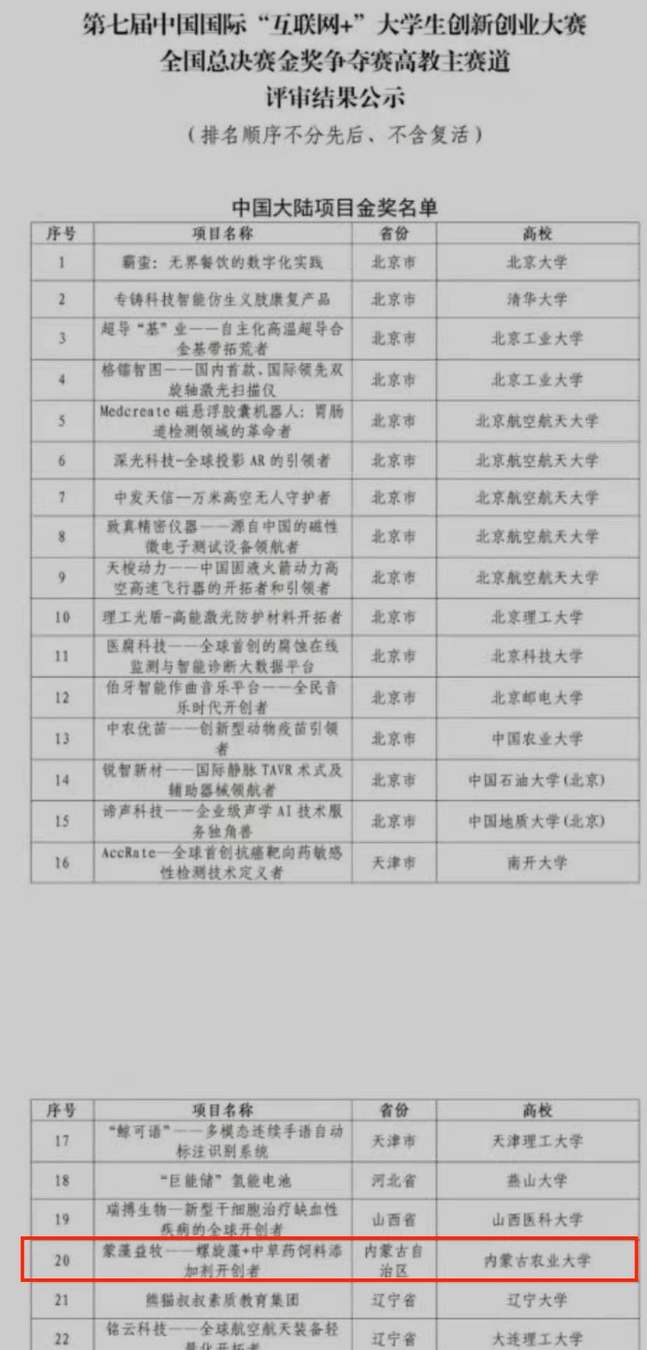 10月14日晚,第七届中国国际“互联网+”大学生创新创业大赛全国总决赛金奖争夺赛高教主赛道评审结果公布,KY开元集团官网的《蒙藻益牧——螺旋藻+中草药饲料添加剂开创者》项目获得金奖,这是内蒙古参加大赛以来的首个金奖。