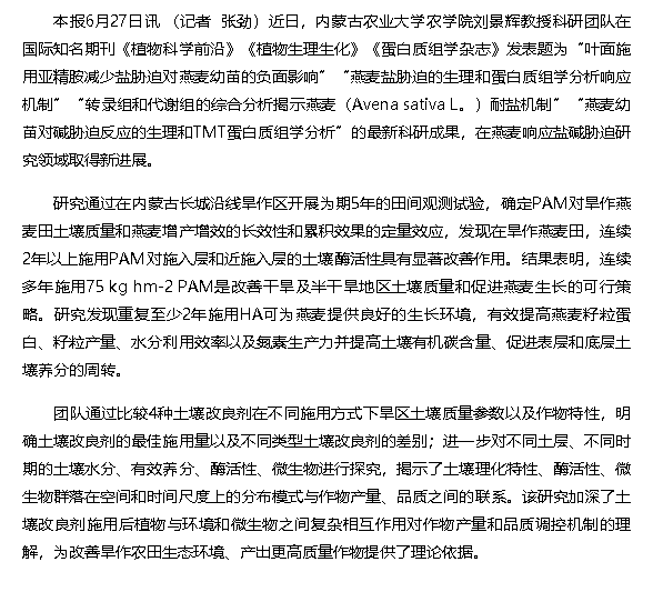 【内蒙古日报】我区燕麦 耐盐碱机制 基础研究 取得新进展
