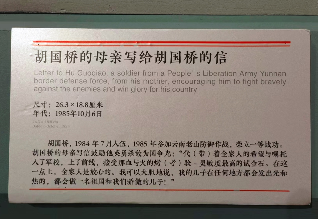 胡国桥母亲写给胡国桥的信(文物简介):胡国桥,1984年7月入伍,1985年参加云南老山防御作战,荣立一等战功。胡国桥母亲写信鼓励他英勇杀敌为国争光:“代(带)着全家人的希望与嘱托入了军校,上了前线,接受那血与火的烤(考)验——灵敏度最高的试金石。在这一点上,全家人是放心的。我可以大胆地说,我的儿子在任何地方都会发出光和热的,都会做一名祖国和我们骄傲的儿子!”