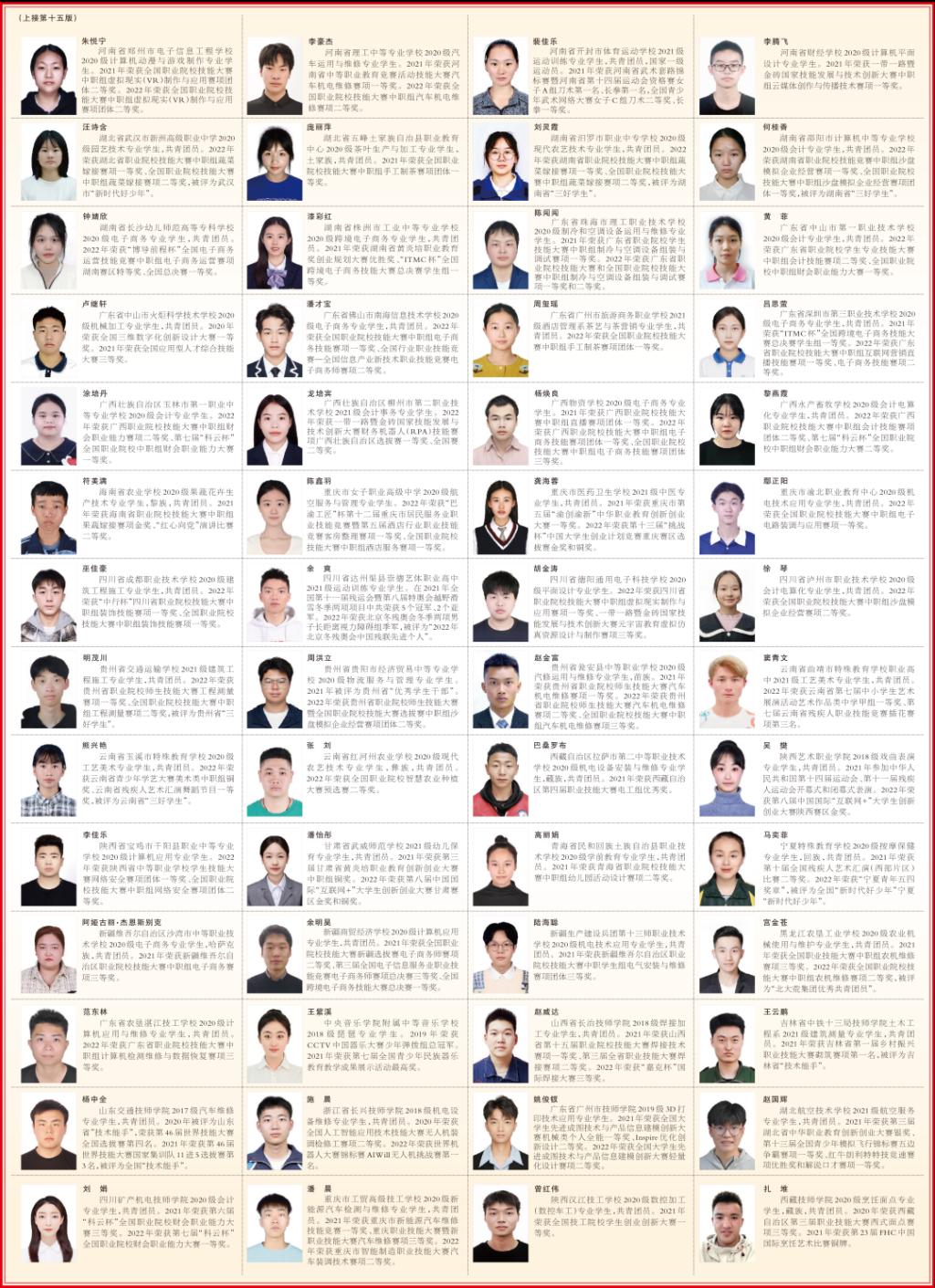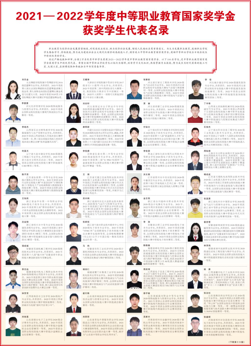 经过严格选拔和评审,全国2万名优秀中职学生荣获2021—2022学年度中等职业教育国家奖学金。以下100名学生,是中等职业教育国家奖学金获奖学生中的优秀代表。希望全国中等职业学校学生以他们为榜样,刻苦学习文化知识,熟练掌握专业技能,努力成长为时代需要的能工巧匠、大国工匠,在拼搏进取和奉献担当中书写青春华章。