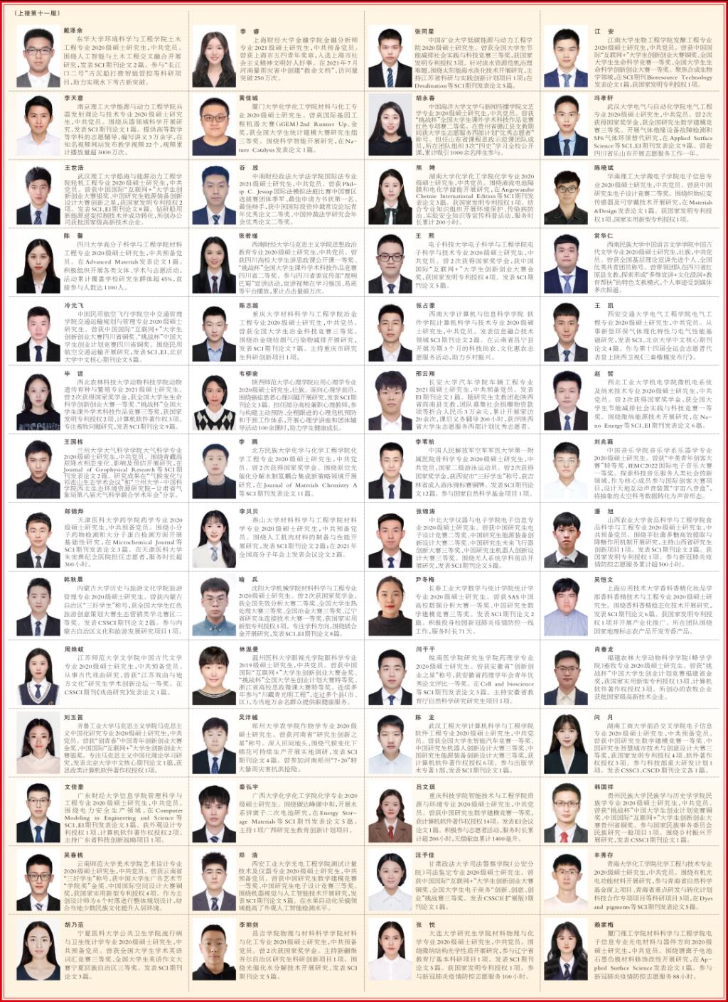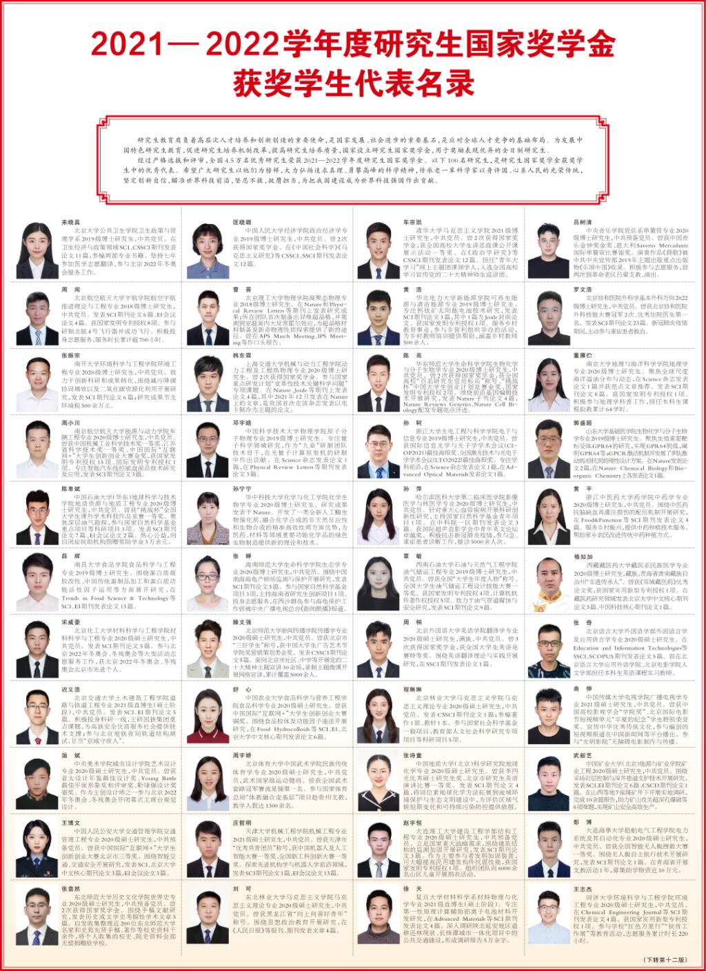经过严格选拔和评审,全国4.5万名优秀研究生荣获2021—2022学年度研究生国家奖学金。以下100名研究生,是研究生国家奖学金获奖学生中的优秀代表。希望广大研究生以他们为榜样,大力弘扬追求真理、勇攀高峰的科学精神,传承老一辈科学家以身许国、心系人民的光荣传统,坚定创新自信,瞄准世界科技前沿,坚忍不拔,挺膺担当,为把我国建设成为世界科技强国作出贡献。